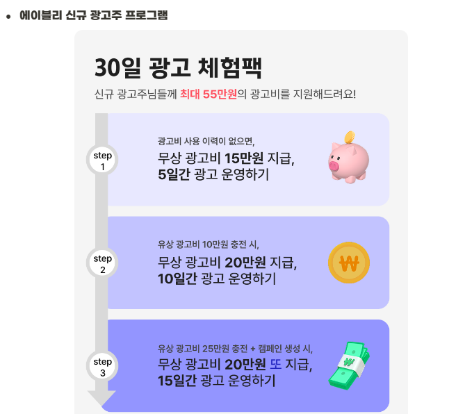 에이블리 광고를 처음 시작하는 신규 판매자라면, ‘신규 광고주 프로그램’에 참여하면 최대 55만원의 광고 비용을 지원받을 수 있어요. 추천 리워드 프로그램까지 더하면 무려 5만 원의 비즈포인트 추가로 받을 수 있습니다! 전 광고를 이미 돌려서 5만원 받을 기회 놓쳤네요ㅠㅠ